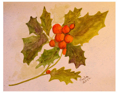 Here's another card for my holiday card collection. I love painting Diane Antone's tutorials from her sketches! I am painting each one on 5x7" Canson watercolor paper. After I paint the design I adhere the painting to a card.