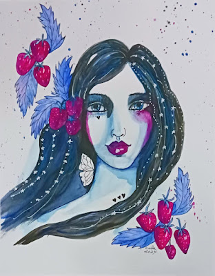 This mixed media Strawberry Girl was from a tutorial by Tamara Laporte for the Kaleidoscope Taster Week. I transferred Tam's drawing onto Fabriano hot press watercolor paper.
