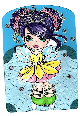 I colored this cute faery using Copic Markers and a bit of white Gelly Roll pen. I cut her out leaving a narrow white edge.